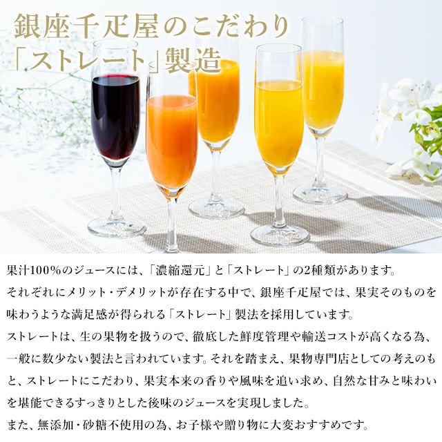 ストレートは、生の果物を扱うので、徹底した鮮度管理や輸送コストが高くなる為、一般に数少ない製法と言われています。それを踏まえ、果物専門店としての考えのもと、ストレートにこだわり、果実本来の香りや風味を追い求め、自然な甘みと味わいを堪能できるすっきりとした後味のジュースを実現しました。
