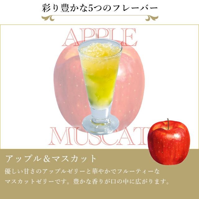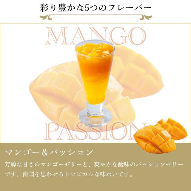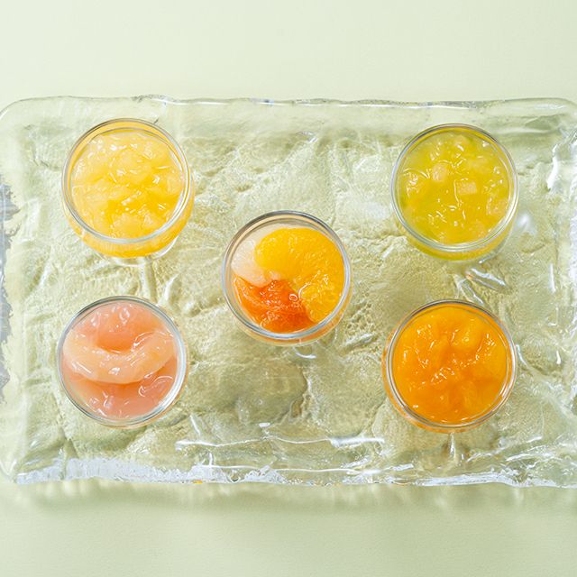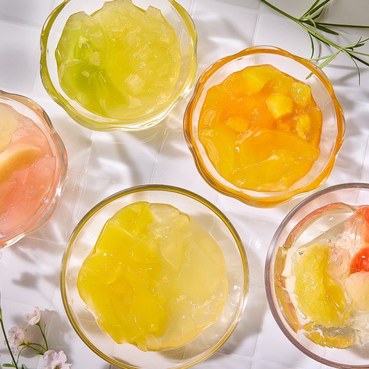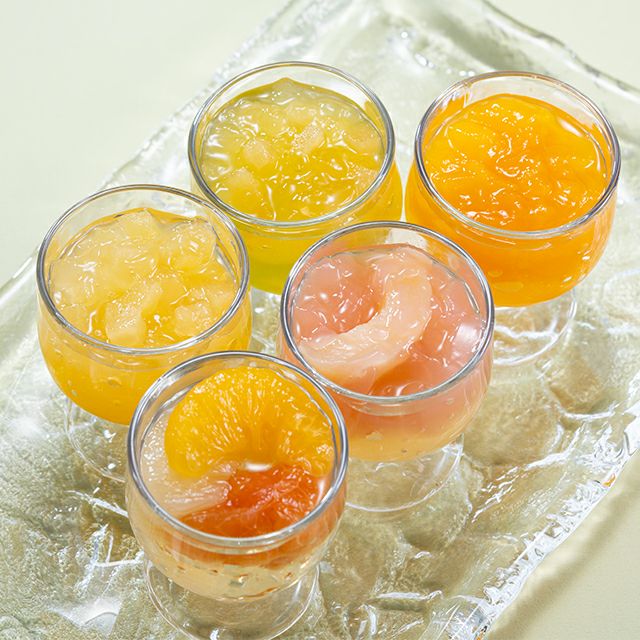 フルーツの美味しさをギュッと閉じ込めた、ジューシーな果肉入りのゼリーと、彩りも美しい2層のゼリーの組み合わせです。