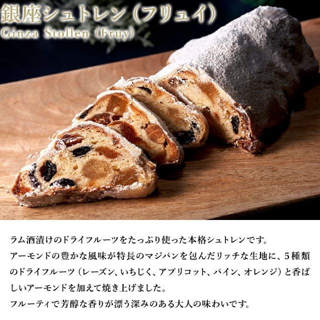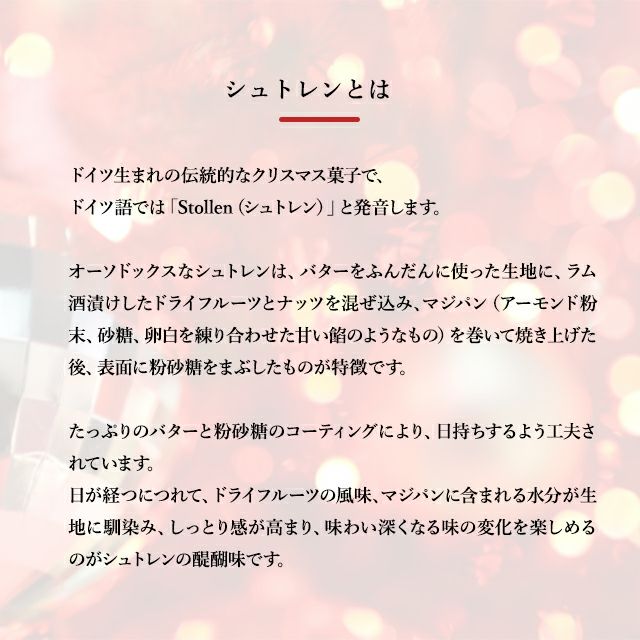 ラム酒漬けのドライフルーツをたっぷり使った本格シュトレンです。フルーティで芳醇な香りが漂う深みのある大人の味わいです。