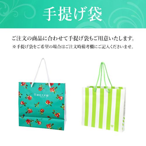 ご用途に応じて包装紙(進物用)と手提げ袋(無料)をご用意しております。 ※手提げ袋をご希望の方は、【決済ステップ】画面下部『通信欄』に必要枚数をご記入下さい。