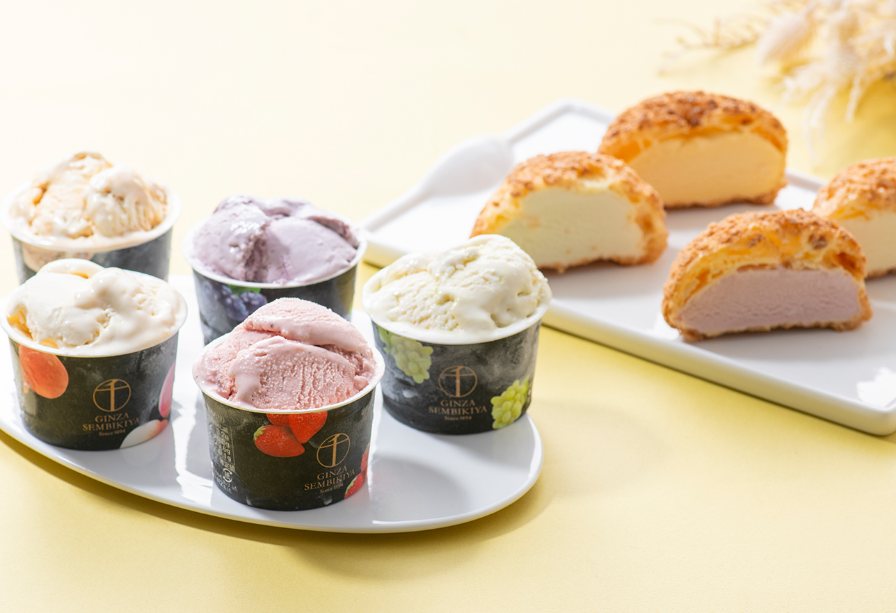 銀座プレミアムアイスと、プレミアムシューアイスの詰め合わせ。銀座千疋屋が厳選した高品質のフルーツは、香り高く芳醇な味わいが濃厚なクリームと絶妙に調和しています。