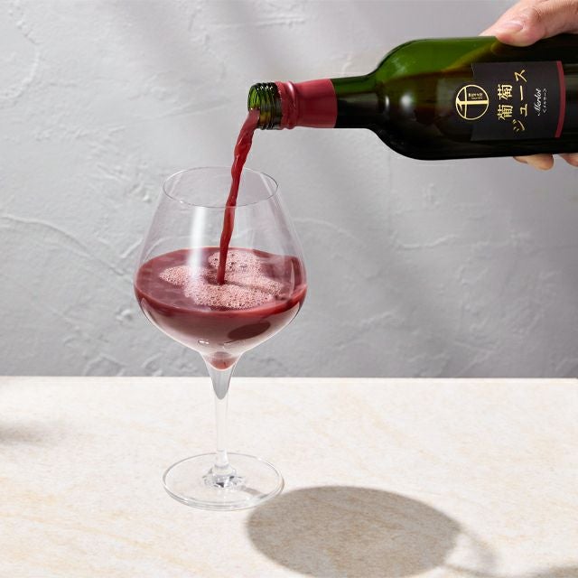 ワイン用の葡萄品種をそのまま、同じ製法で。ワインに使用される糖度の高い葡萄品種を手作業で丁寧に実をはずし、贅沢な搾汁率で搾り完全無加糖・無添加・無還元で仕上げた、まるでワインのような濃厚ジュースです。