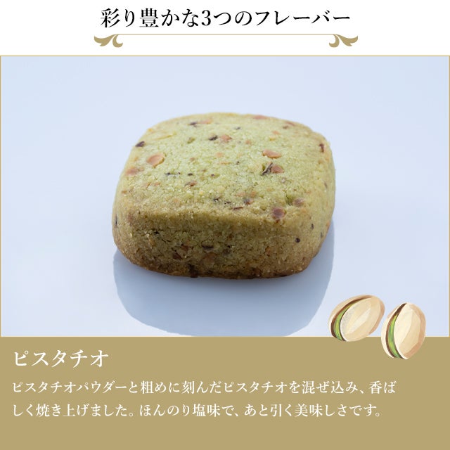 フルーツの風味が楽しめるクッキーは、ストロベリー、ピスタチオ、チョコオレンジの3種で、さっくりとした食感に仕上げました。