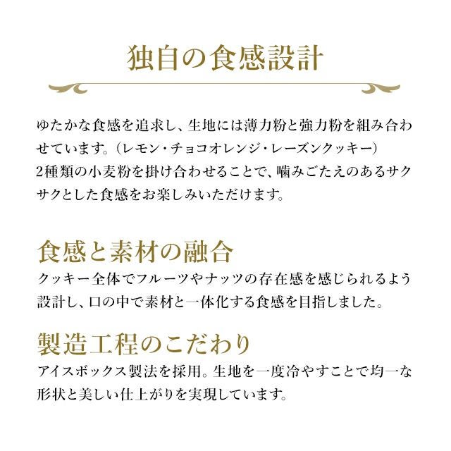 ゆたかな食感を追求し、生地には薄力粉と強力粉を組み合わせています。(レモン・チョコオレンジ・レーズンクッキー)