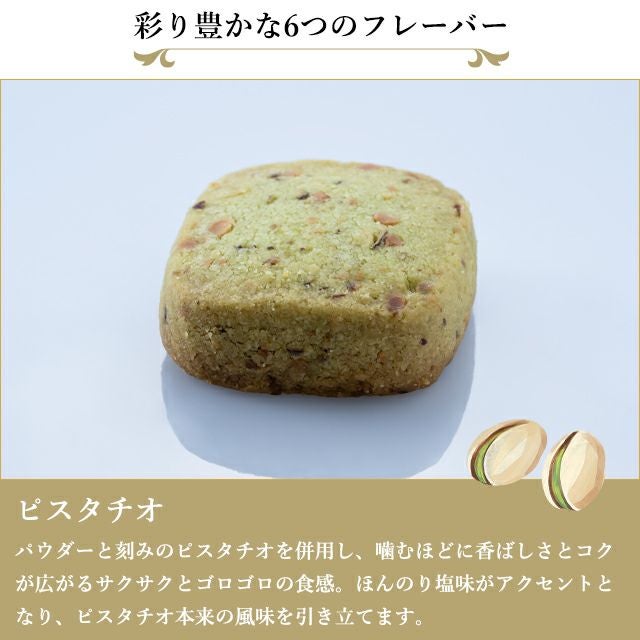 ■ピスタチオ:パウダーと刻みのピスタチオを併用し、噛むほどに香ばしさとコクが広がるサクサクとゴロゴロの食感。