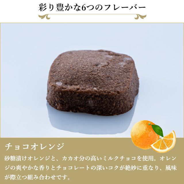 ■チョコオレンジ:砂糖漬けオレンジと、カカオ分の高いミルクチョコを使用。