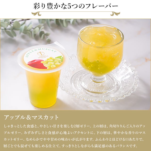 しゃきっとした食感と、やさしい甘さを楽しむ2層ゼリー。上の層は、角切りりんご入りのアップルゼリー。みずみずしさと食感が心地よいアクセントに。下の層は、華やかな香りのマスカットゼリー。なめらかでやや甘めの味わいが広がります。ふんわりとほどける口あたりで、層ごとでも混ぜても楽しめる仕立て。すっきりとしながらも満足感のあるバランスです。