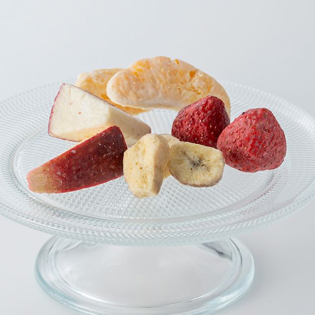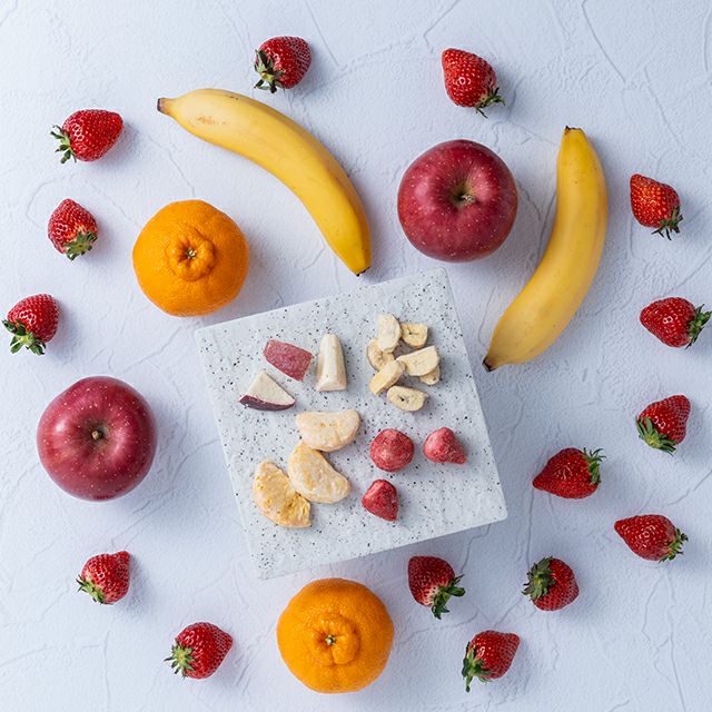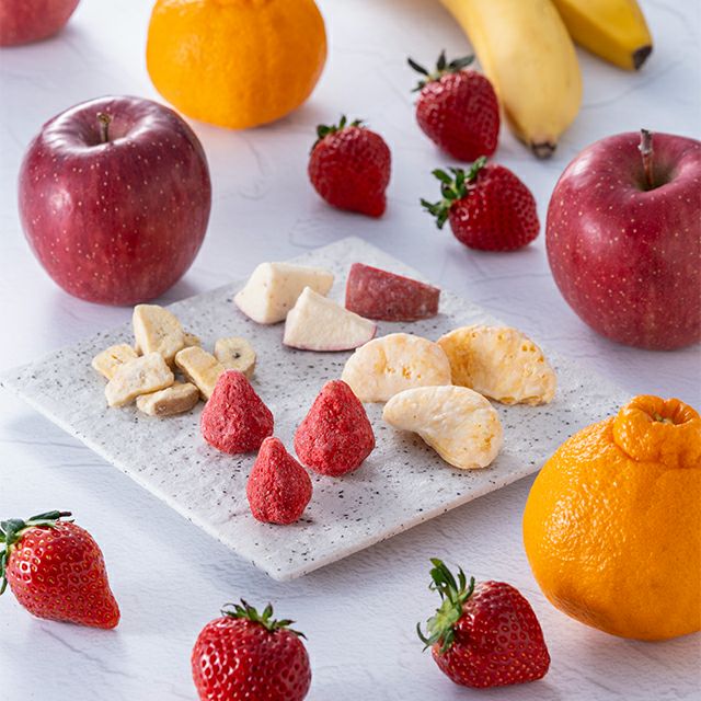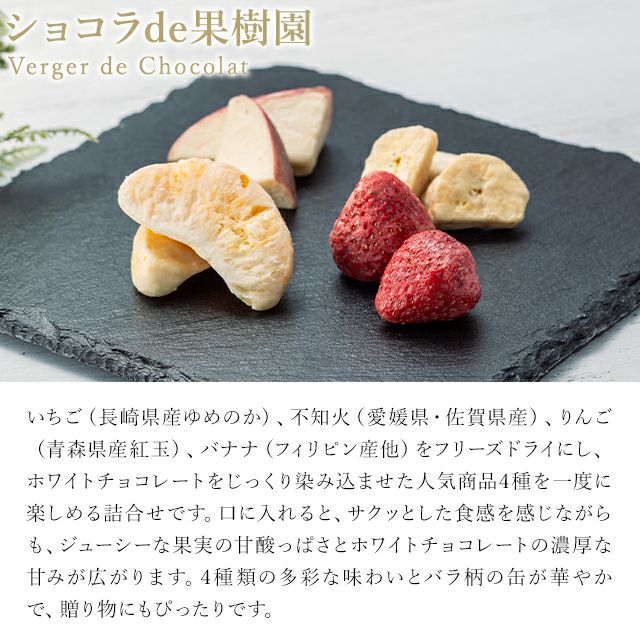 香り豊かな“ゆめのかいちご(長崎県産)”、甘酸っぱい“紅玉りんご(国産)”、爽やかな香りの“不知火(国産)”、甘くコクのある“バナナ(フィリピン他)”をフリーズドライにし、ホワイトチョコレートを染み込ませました。