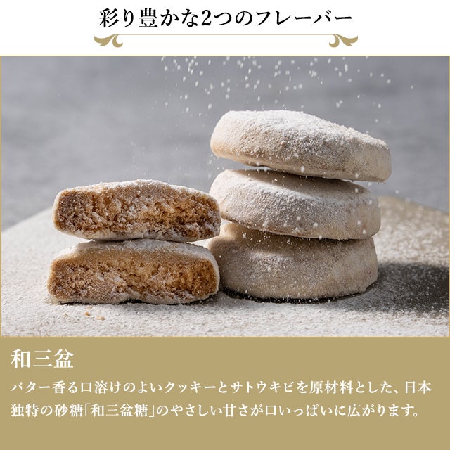 バター香る口溶けのよいクッキーとサトウキビを原材料とした、日本独特の砂糖「和三盆糖」のやさしい甘さが口いっぱいに広がります。