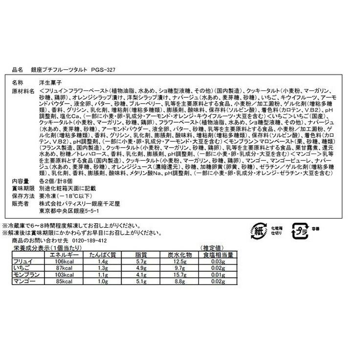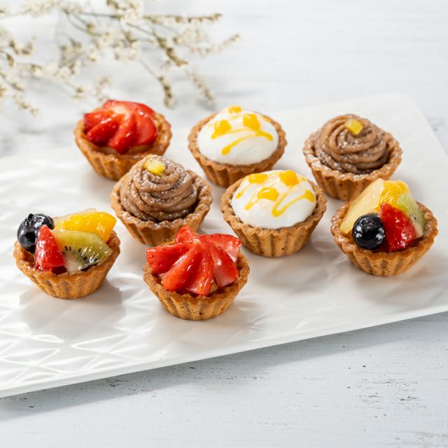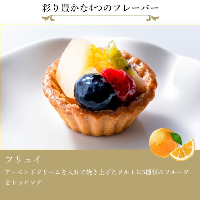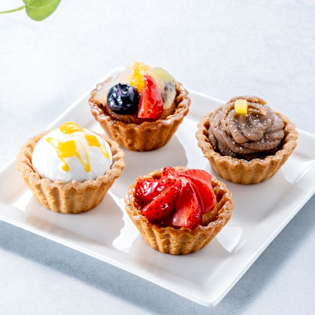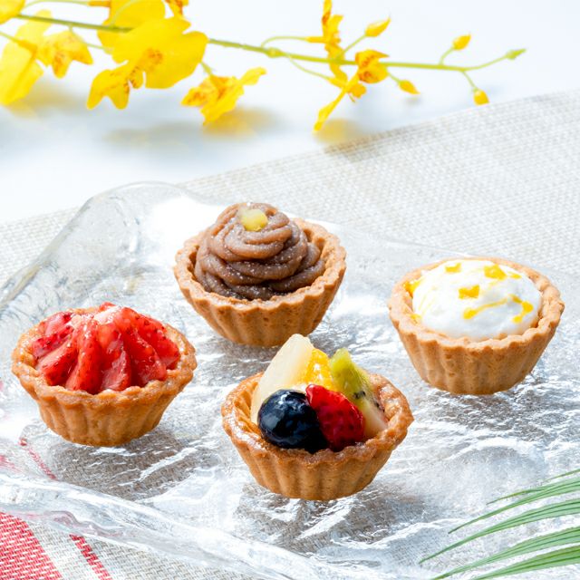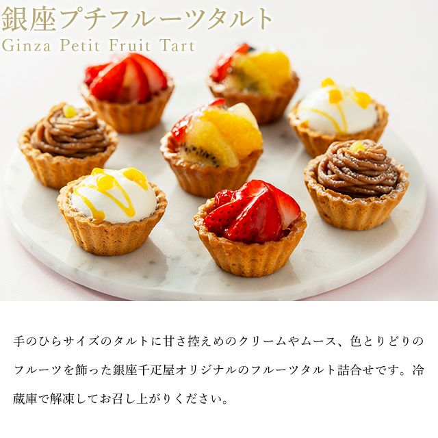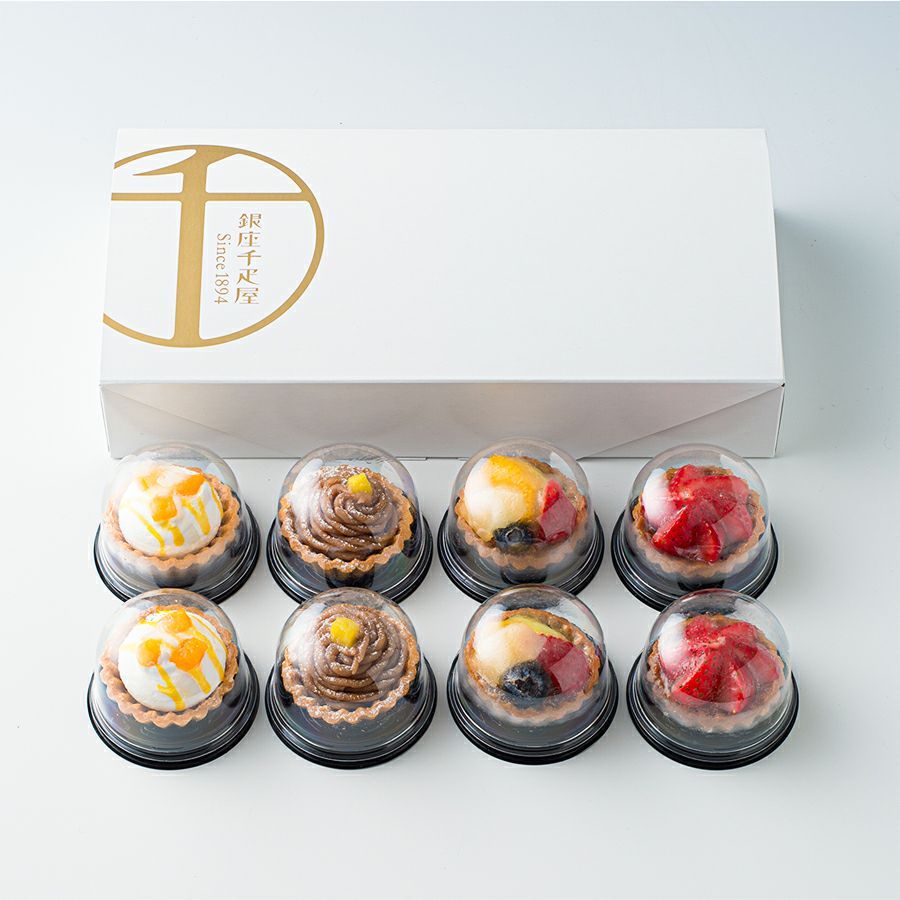 手のひらサイズのタルトに甘さ控えめのクリームやムース、色とりどりのフルーツを飾った銀座千疋屋オリジナルのフルーツタルト詰合せです。