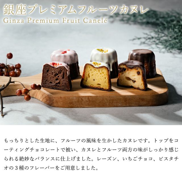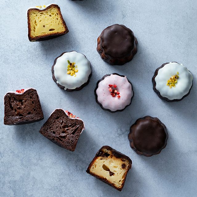 もっちりとした生地に、フルーツの風味を生かしたカヌレです。トップをコーティングチョコレートで被い、カヌレとフルーツ両方の味がしっかり感じられる絶妙なバランスに仕上げました。レーズン、いちごチョコ、ピスタチオの3種のフレーバーをご用意しました。