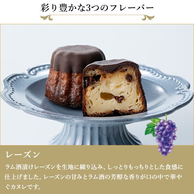 ラム酒漬けレーズンを生地に練り込み、しっとりもっちりとした食感に仕上げました。レーズンの甘みとラム酒の芳醇な香りが口の中で華やぐカヌレです。