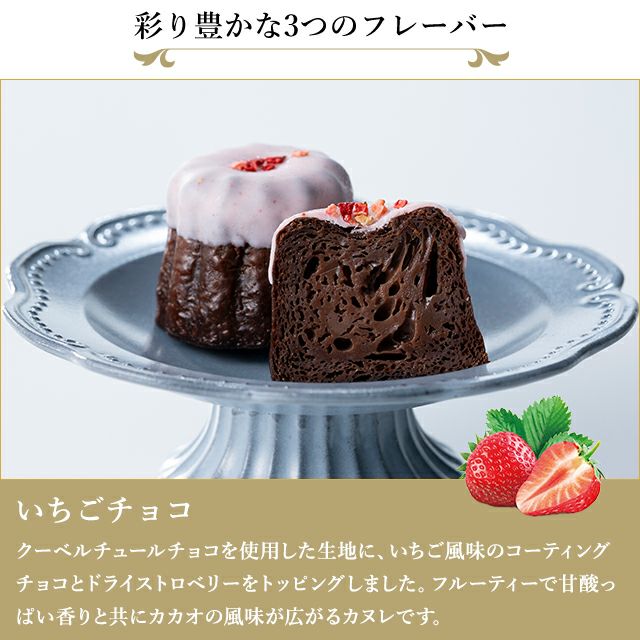 クーベルチュールチョコを使用した生地に、いちご風味のコーティングチョコとドライストロベリーをトッピングしました。フルーティーで甘酸っぱい香りと共にカカオの風味が広がるカヌレです。