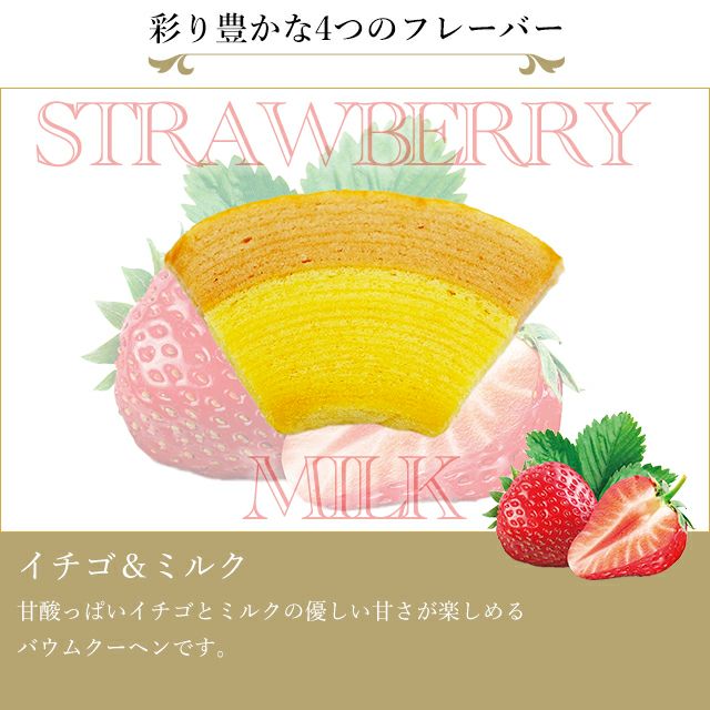 甘酸っぱいイチゴとミルクの優しい甘さが楽しめるバウムクーヘンです。