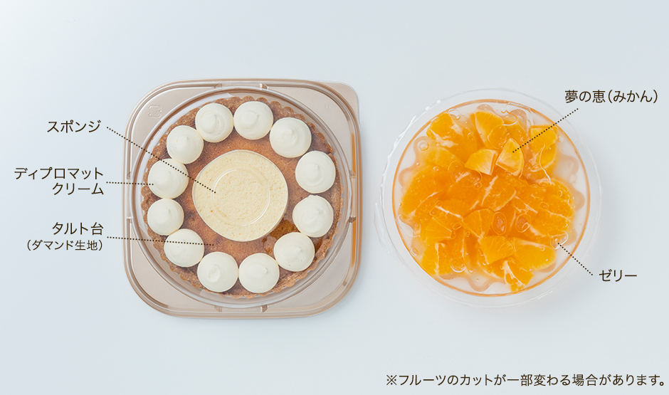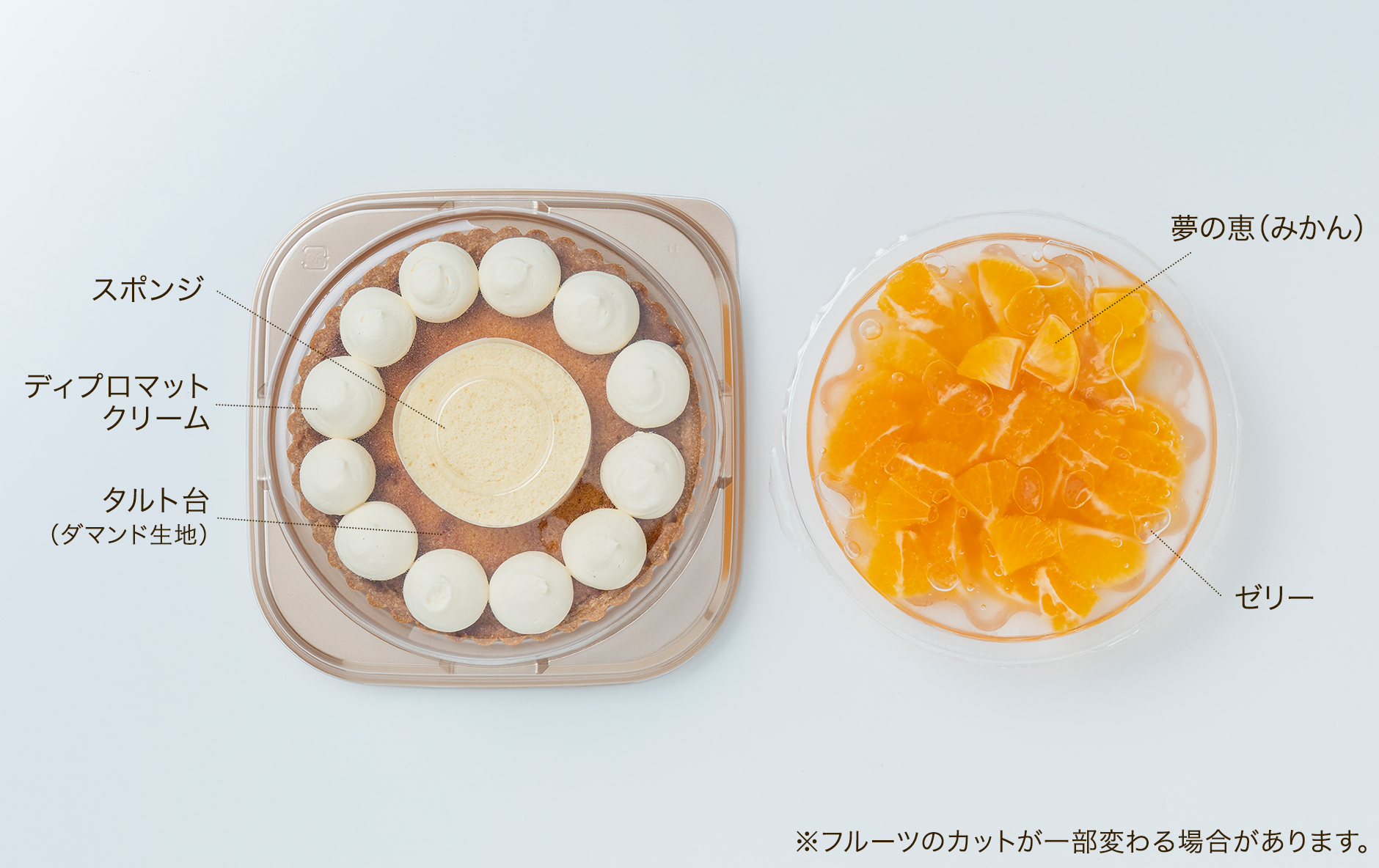 ・タルト台:タルト台(国内製造)、カスタードクリーム、スポンジ生地、乳製品、乳等を主要原料とする食品、砂糖、水飴/糊料(加工澱粉、カラギーナン)、乳化剤、香料、メタリン酸Na、(一部に乳成分・小麦・卵・アーモンドを含む)