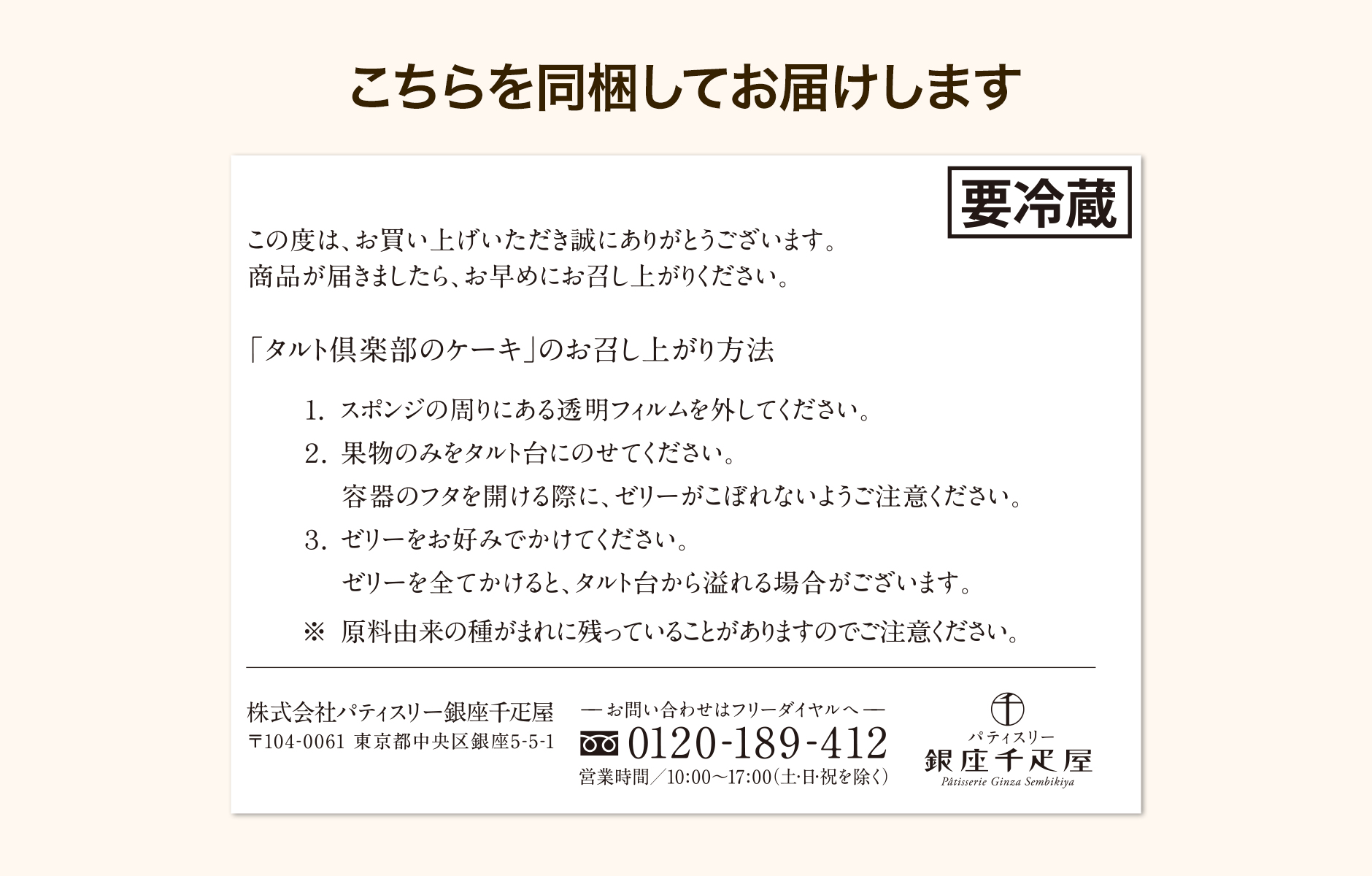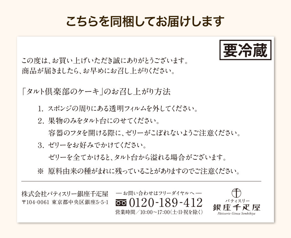 ・冷蔵ケーキですので、発送後はお早めのお受け取りをお願いいたします。消費期限に関わらず、お早めにお召し上がりください。