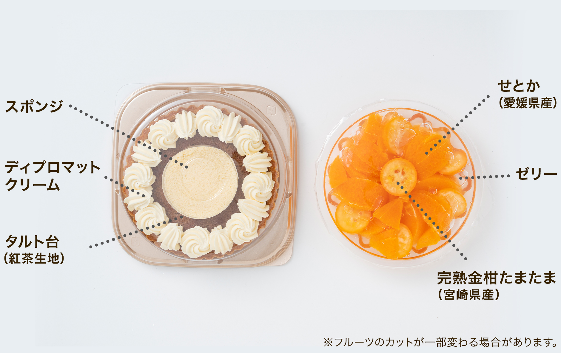 ■タルト台:紅茶タルト台(国内製造)、カスタードクリーム、乳製品、スポンジ生地、乳等を主要原料とする食品、砂糖、水あめ、ゼラチン/乳化剤、香料、安定剤(メタリン酸Na、カラギーナン)、糊料(加工澱粉)、(一部に小麦・乳成分・卵・アーモンド・ゼラチンを含む)