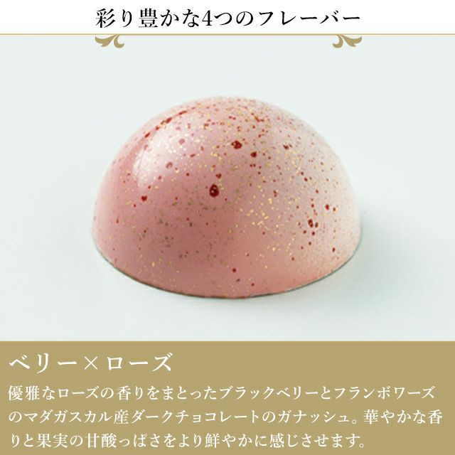 果実のみずみずしさと花の香りを重ねた、4つのガナッシュは、パステルカラーで彩られ見た目も愛らしく、目でも楽しめます。