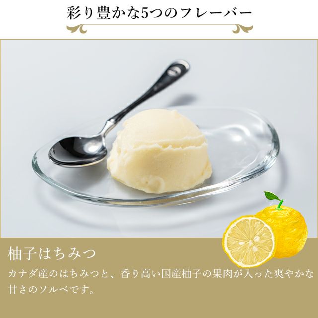 カナダ産の最高級はちみつと、香り高い国産柚子の果肉がたっぷり入った爽やかな甘さのソルベです。