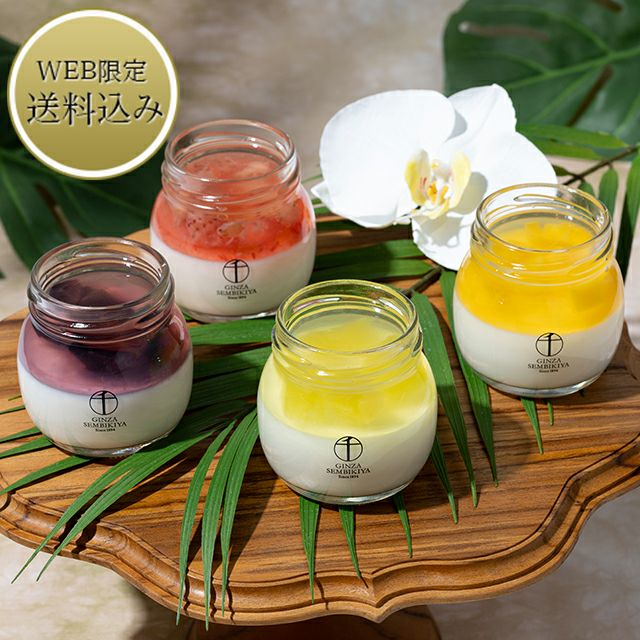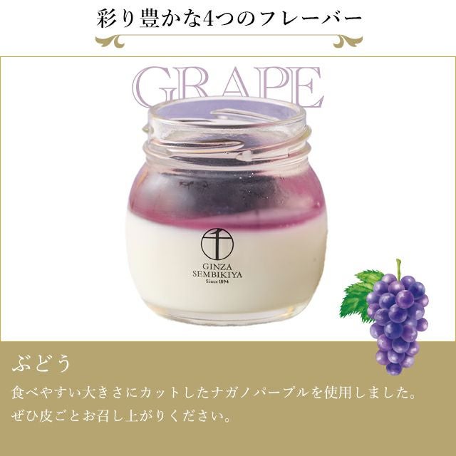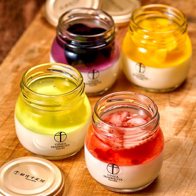 フレッシュな果物を使用した4種類のフルーツゼリーと口当たりなめらかな杏仁豆腐を瓶に閉じ込めました。