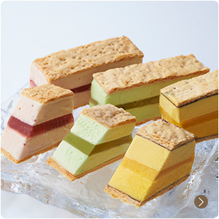 チョコレートを敷いたパイ生地で、濃厚なアイスクリーム・フルーツソースをサンドしました。