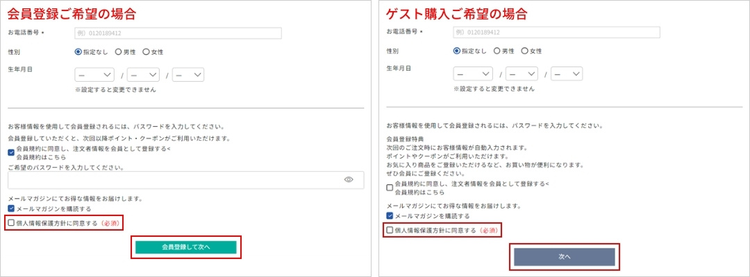※「個人情報保護方針に同意する」は必須項目のため、チェックを入れないと次へ進むことができません。