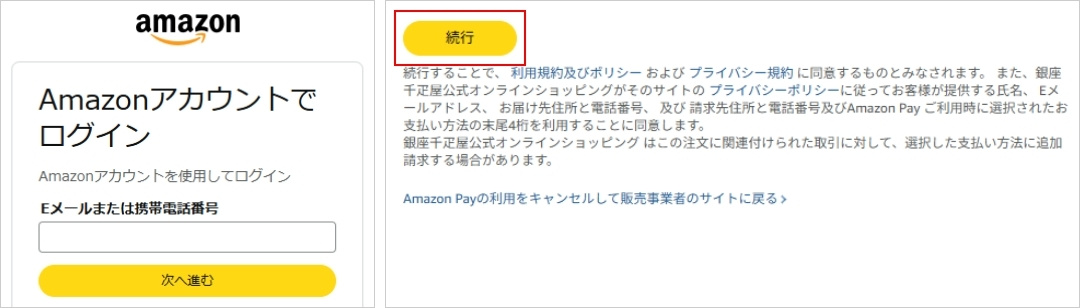 Amazonアカウントでログインし、表示されたページで「続行」をクリックしてください。