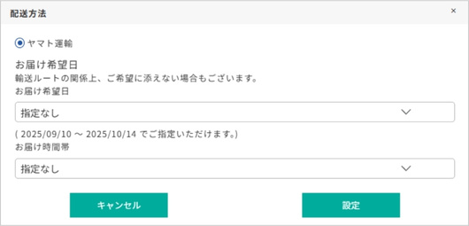 配送日時の指定が可能な商品は、「ヤマト運輸」の下にある「変更」よりご希望の日時指定が可能です。