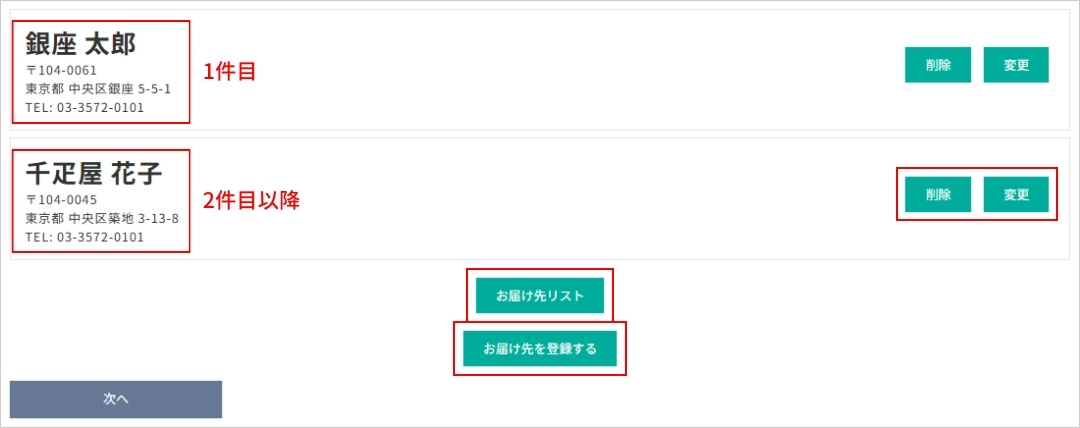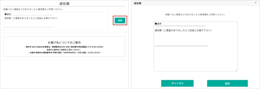 ・表示されているお届け先のお名前、ご住所、電話番号に変更がある場合は、「変更」ボタンから修正できます。