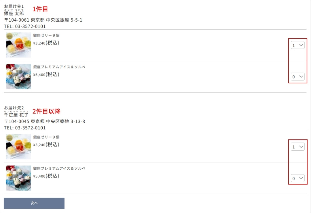 4. 各お届け先に、どの商品をいくつお届けするかを設定します。
