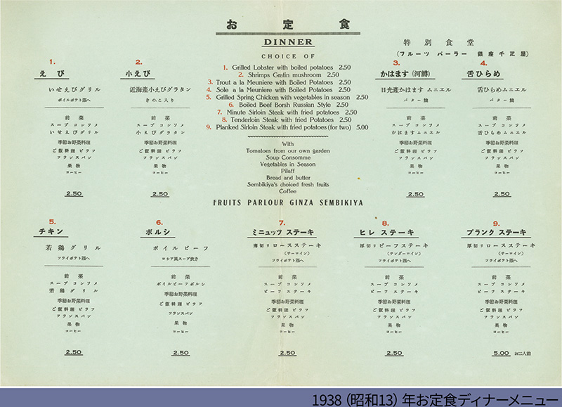 ・現存する最古のメニューにお定食(ランチ・ディナー)の記載があり、1999(平成11)年、銀座八丁目本店の閉店まで継続。 - ●1939(昭和14)年7月1日