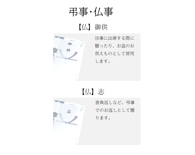| 仏事年忌法要 | 仏事の年忌法要 | 御佛前 | 苗字またはなくても良い | 49日(忌明け)以降の弔事に使われます。※仏式のみ |
