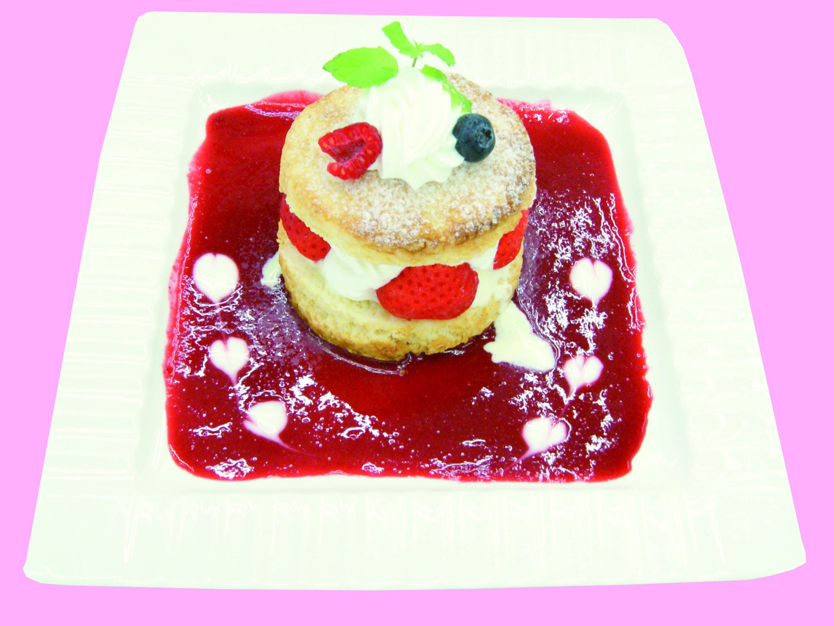 苺とたっぷりの生クリームをスコーンで挟み、甘酸っぱいフランボワーズソースを合わせました。