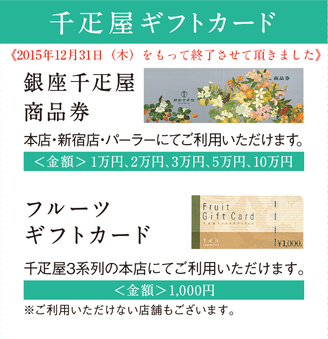 この度、誠に勝手ではございますが、「千疋屋フルーツギフトカード」、「銀座千疋屋商品券」の販売を2015年12月31日(木)をもって終了とさせていただきました。