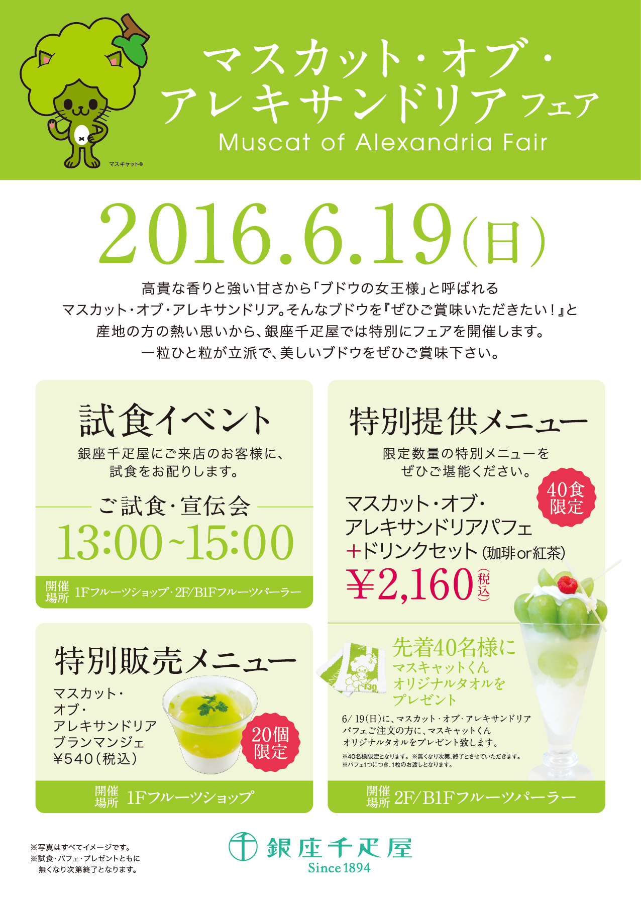銀座千疋屋銀座本店(中央区銀座5-5-1)にて、2016年6月19日(日)に岡山県産 “マスカット・オブ・アレキサンドリア フェア”を開催いたします。