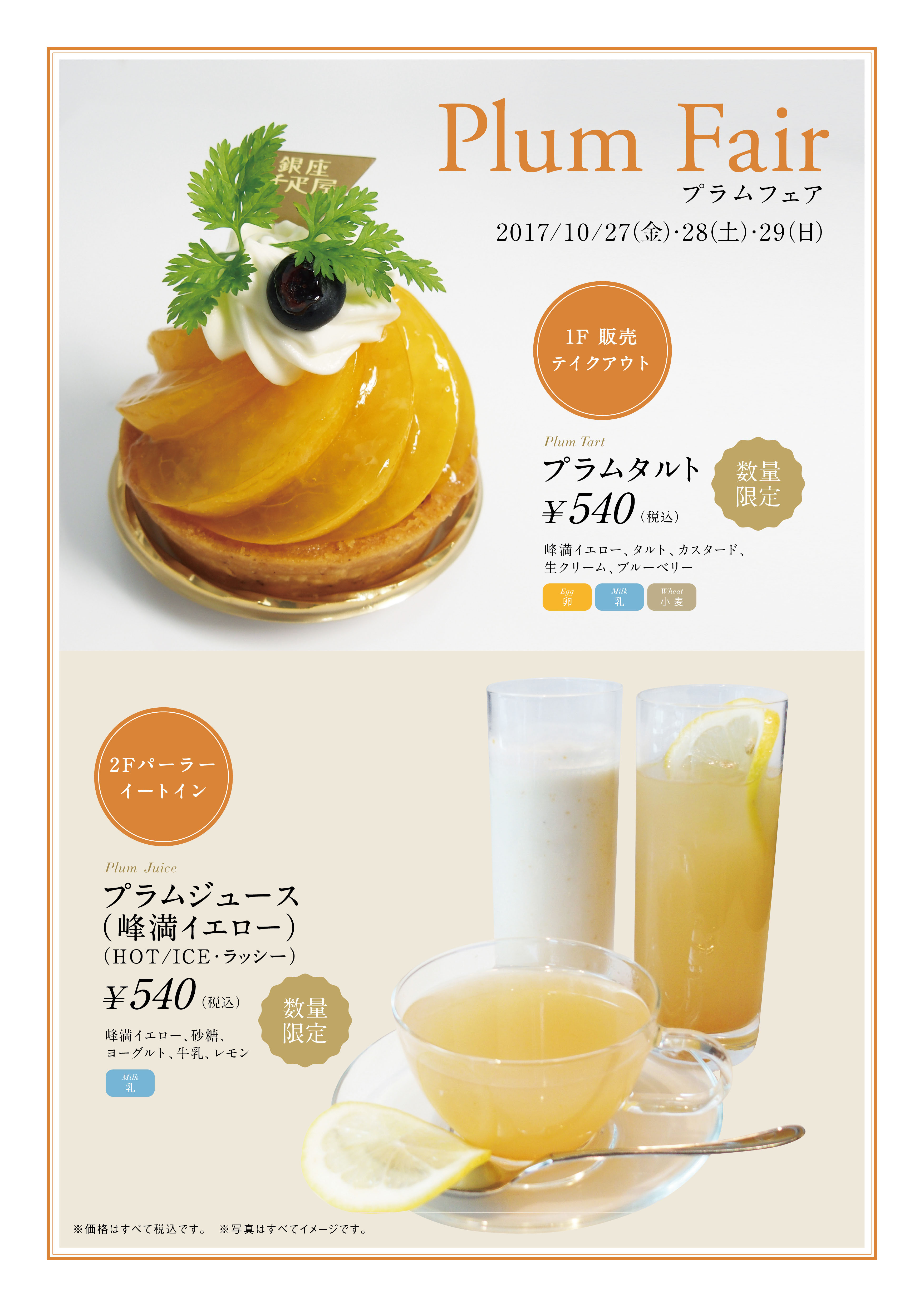 銀座千疋屋・パティスリー銀座千疋屋は、2017年10月27日(金)〜10月29日(日)にて、期間・数量限定”プラムタルト”を販売いたします。