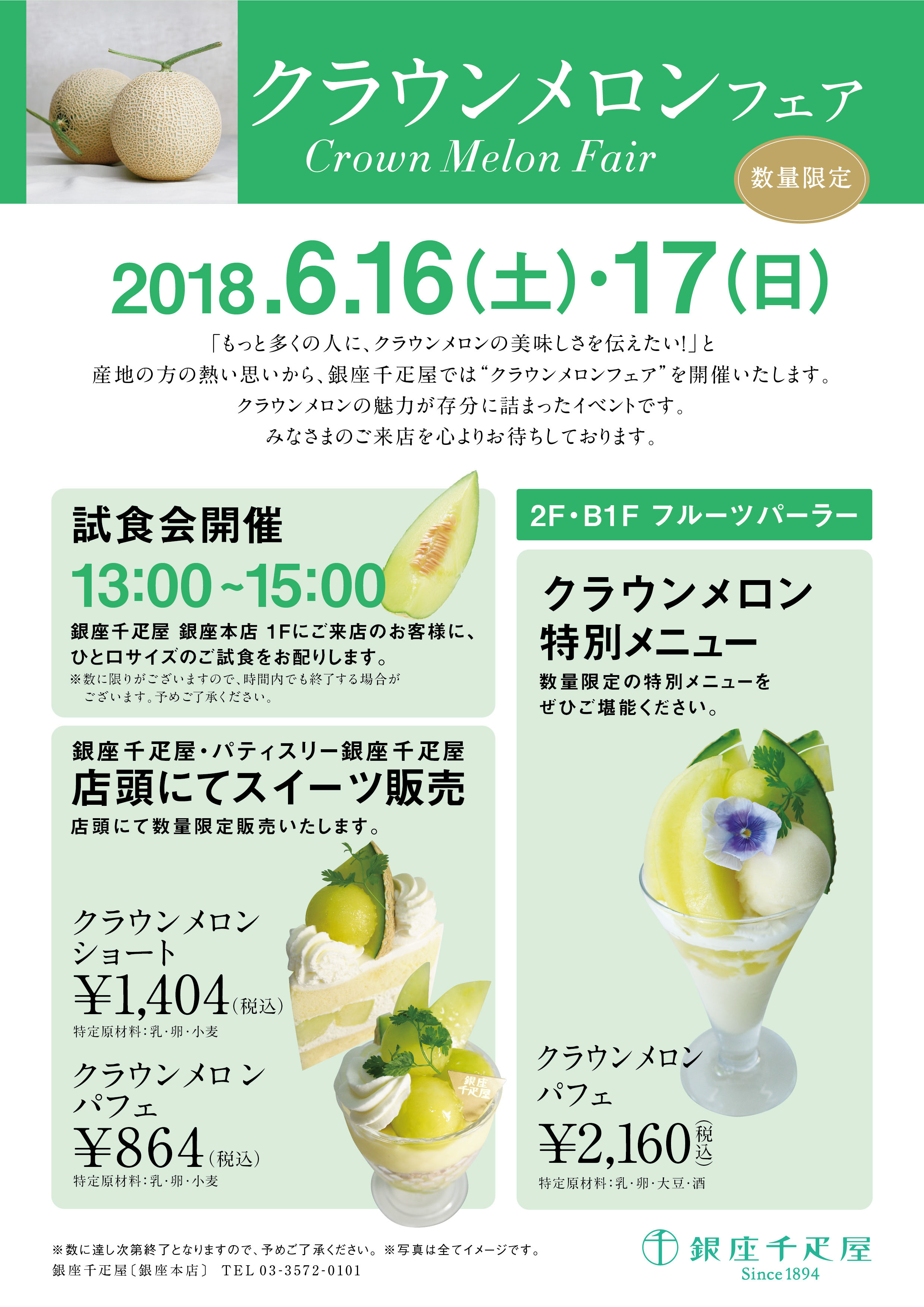 銀座千疋屋・パティスリー銀座千疋屋では、2018年6月16日(土)・6月17日(日)の2日間に渡って、「静岡県産 クラウンメロンフェア 」を開催いたします。