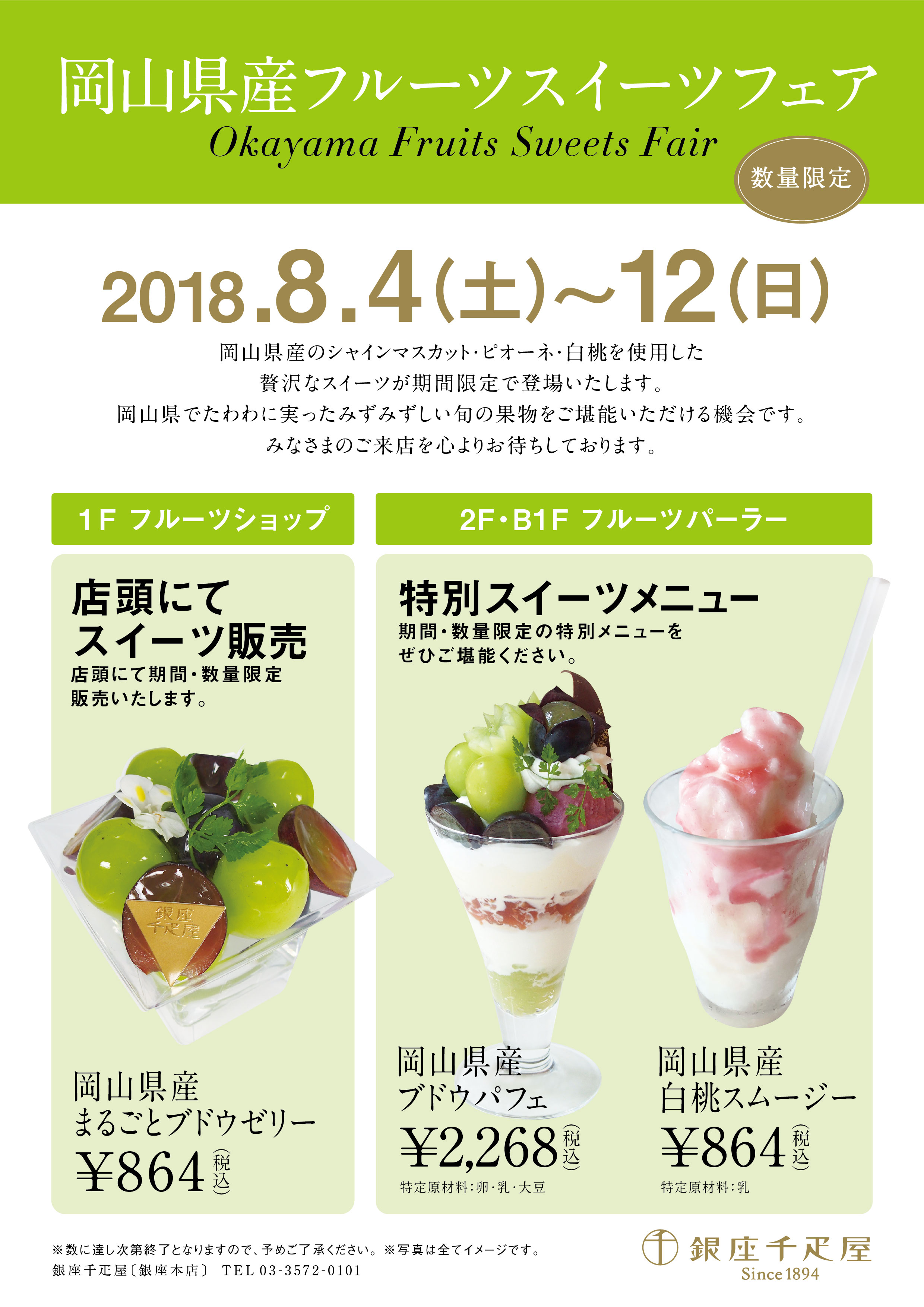 銀座千疋屋・パティスリー銀座千疋屋では、2018年8月4日(土)〜8月12日(日)にて、岡山県産のシャインマスカット・ピオーネ・白桃を使用した贅沢なスイーツを販売いたします。