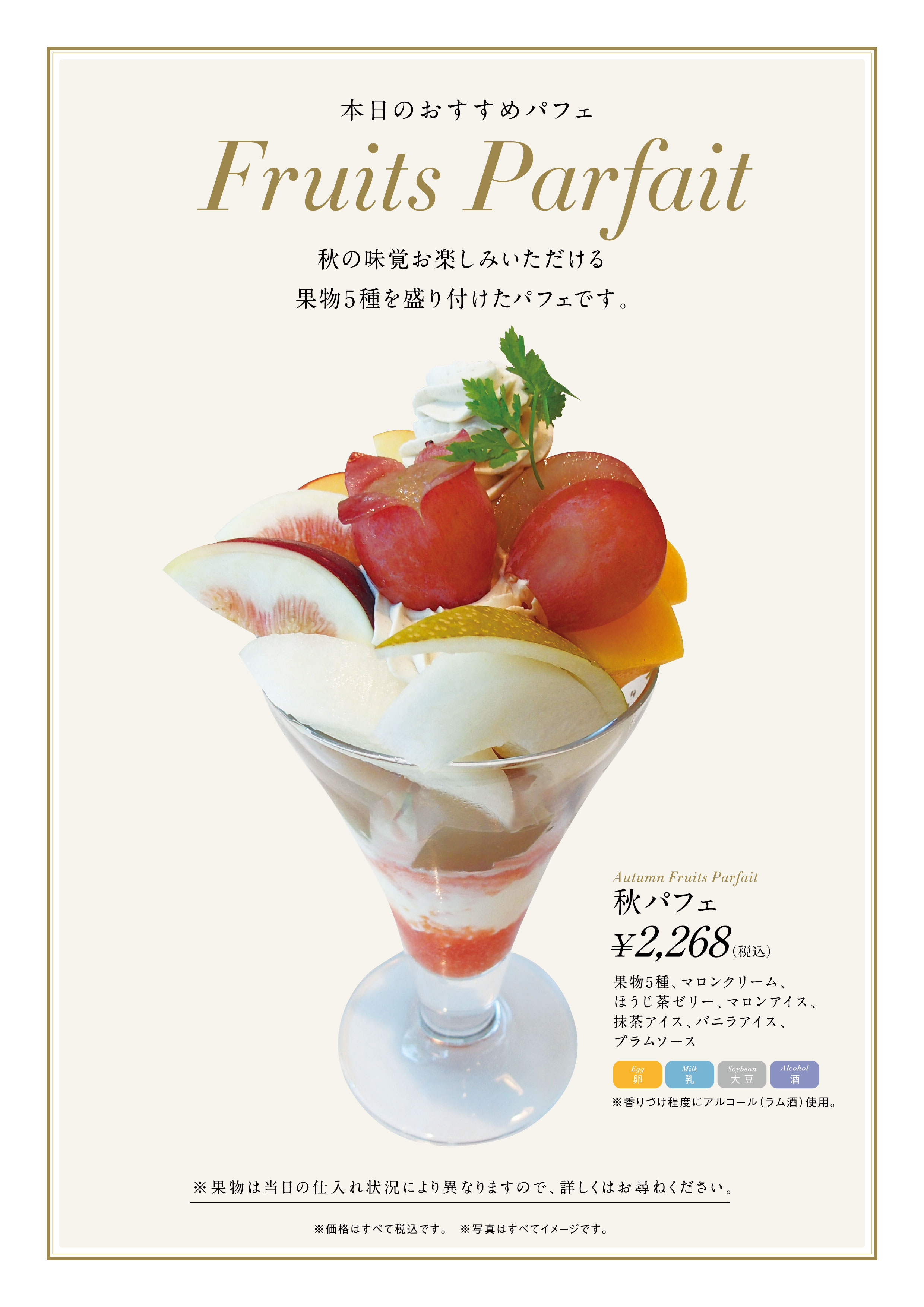 銀座本店 フルーツパーラーでは、9月1日(土)より秋の果物を贅沢に5種使用した「秋パフェ」を販売いたします。