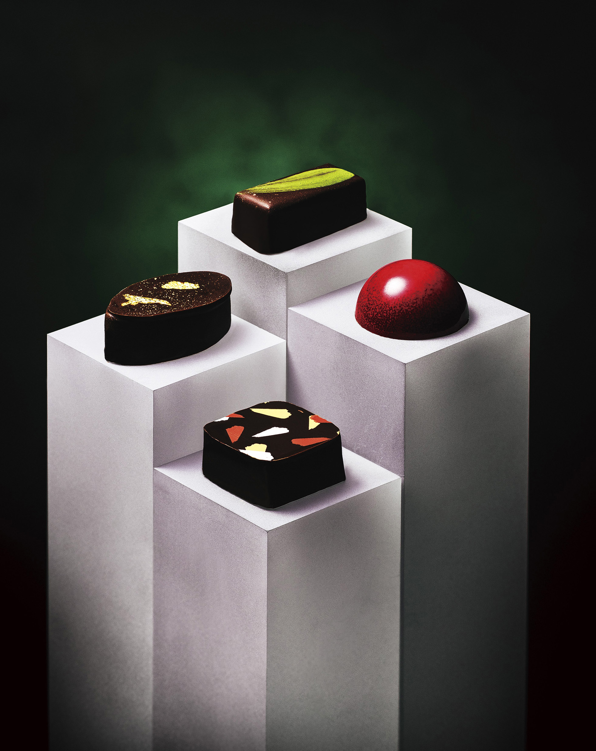 シシリー産のピスタチオペーストを混ぜ合わせたホワイトチョコレートガナッシュに、うま味と甘みのバランスが良い「ムーンソルト」を加え深みを持たせました。そして、紅秀峰(さくらんぼ)の果肉入りソースを合わせ、口どけ滑らかで風味豊かな逸品に仕上げました。