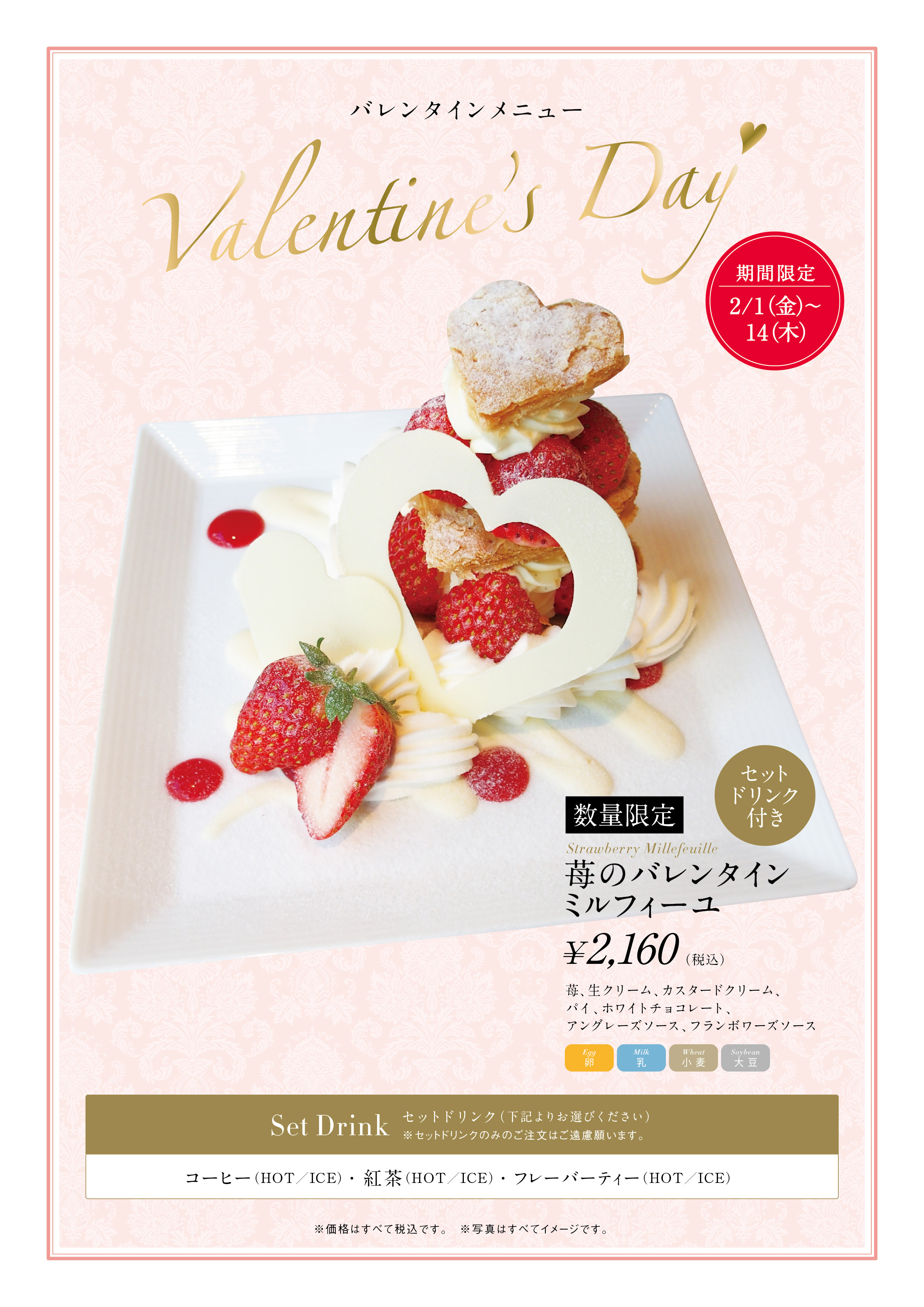 メニュー名:苺のバレンタインミルフィーユ(セットドリンク付き)