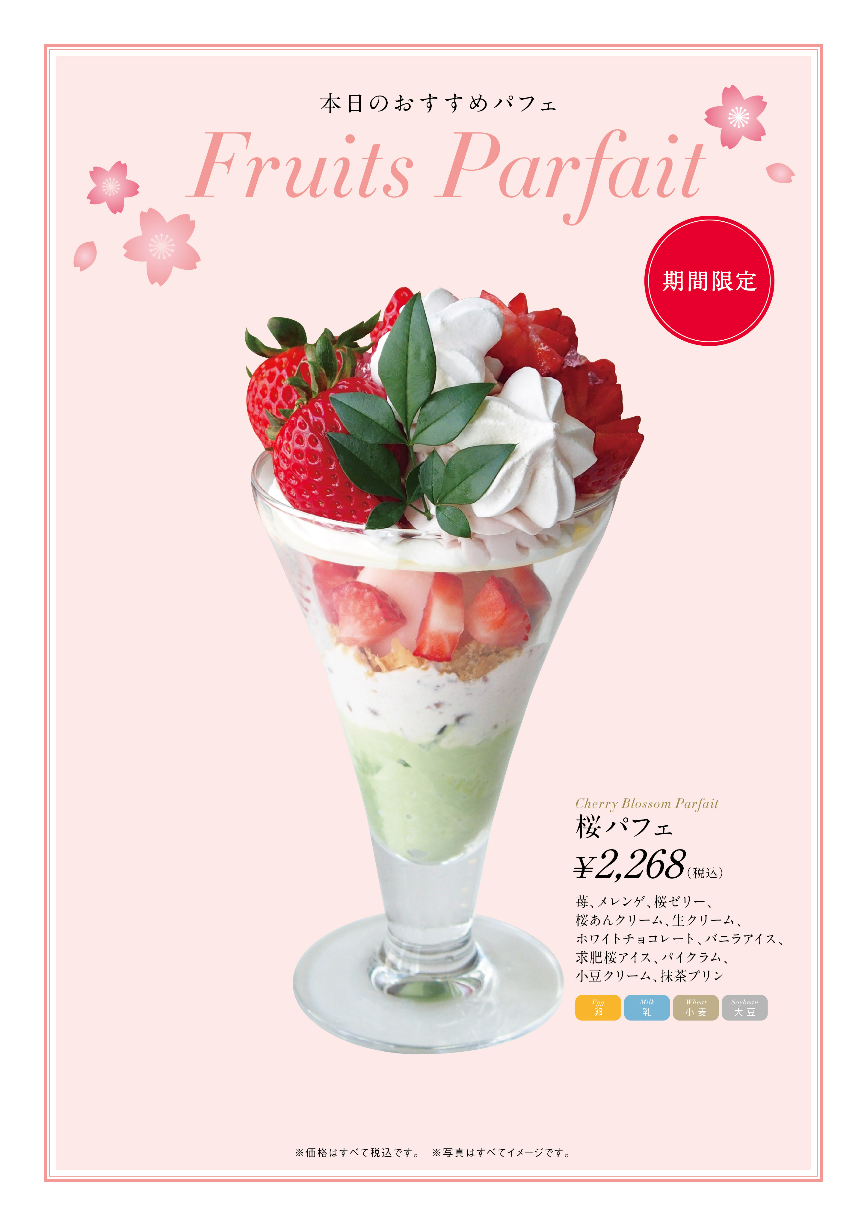 内容:苺、メレンゲ、桜ゼリー、桜あんクリーム、生クリーム、ホワイトチョコレート、バニラアイス、求肥桜アイス、パイクラム、小豆クリーム、抹茶プリン