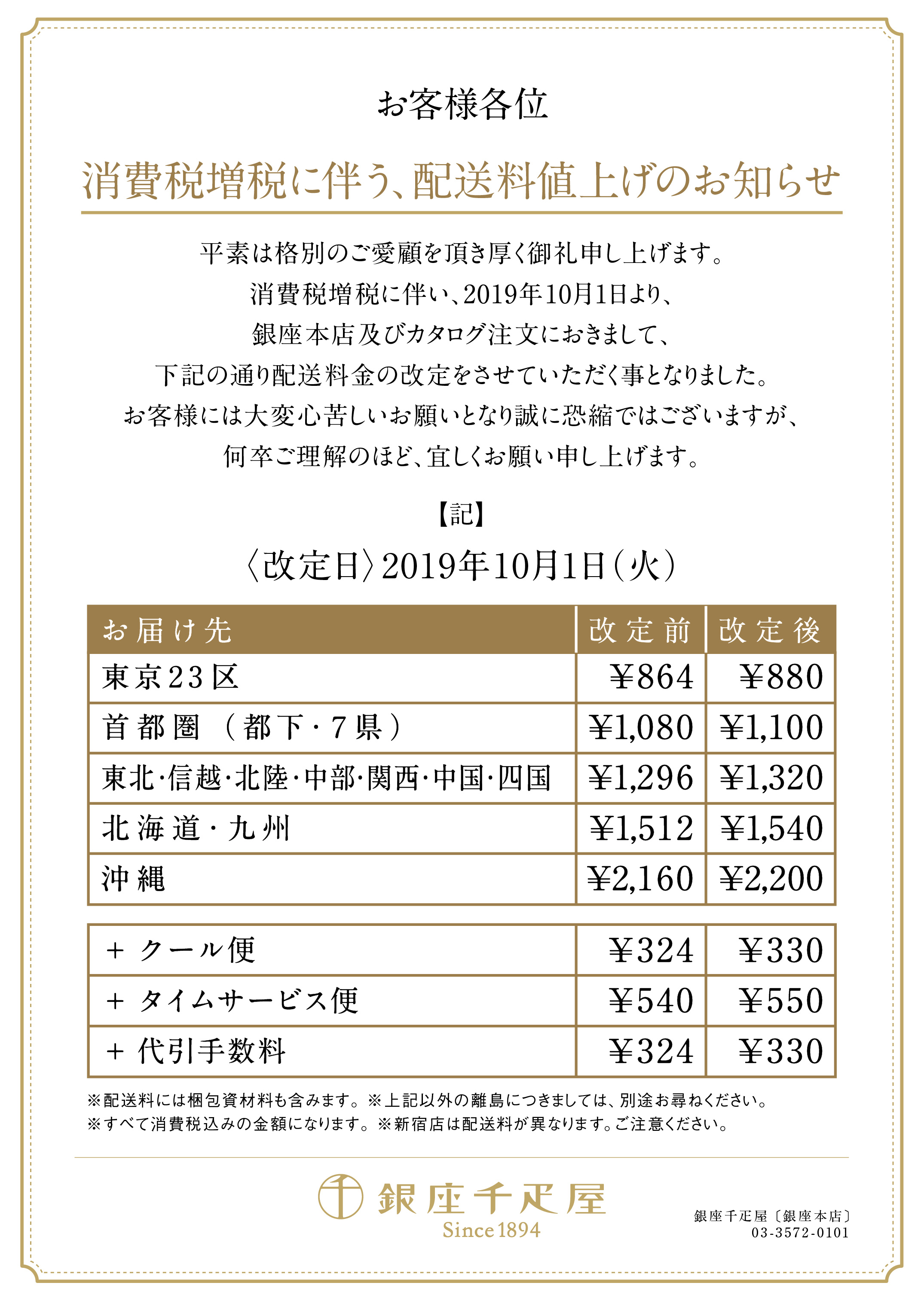 さてこの度、消費税増税に伴い、2019年10月1日より、銀座本店及びカタログ注文におきまして、下記の通り配送料金の改定をさせていただく事となりました。