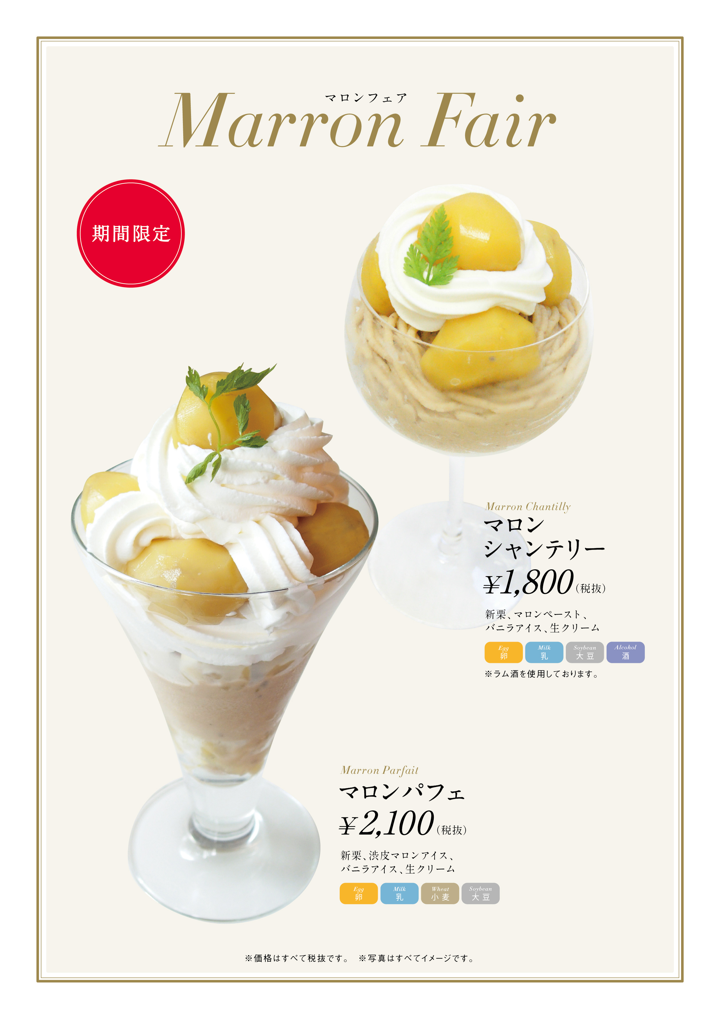 毎年ご好評いただいております”マロンパフェ”と”マロンシャンテリー”をご用意いたしました。