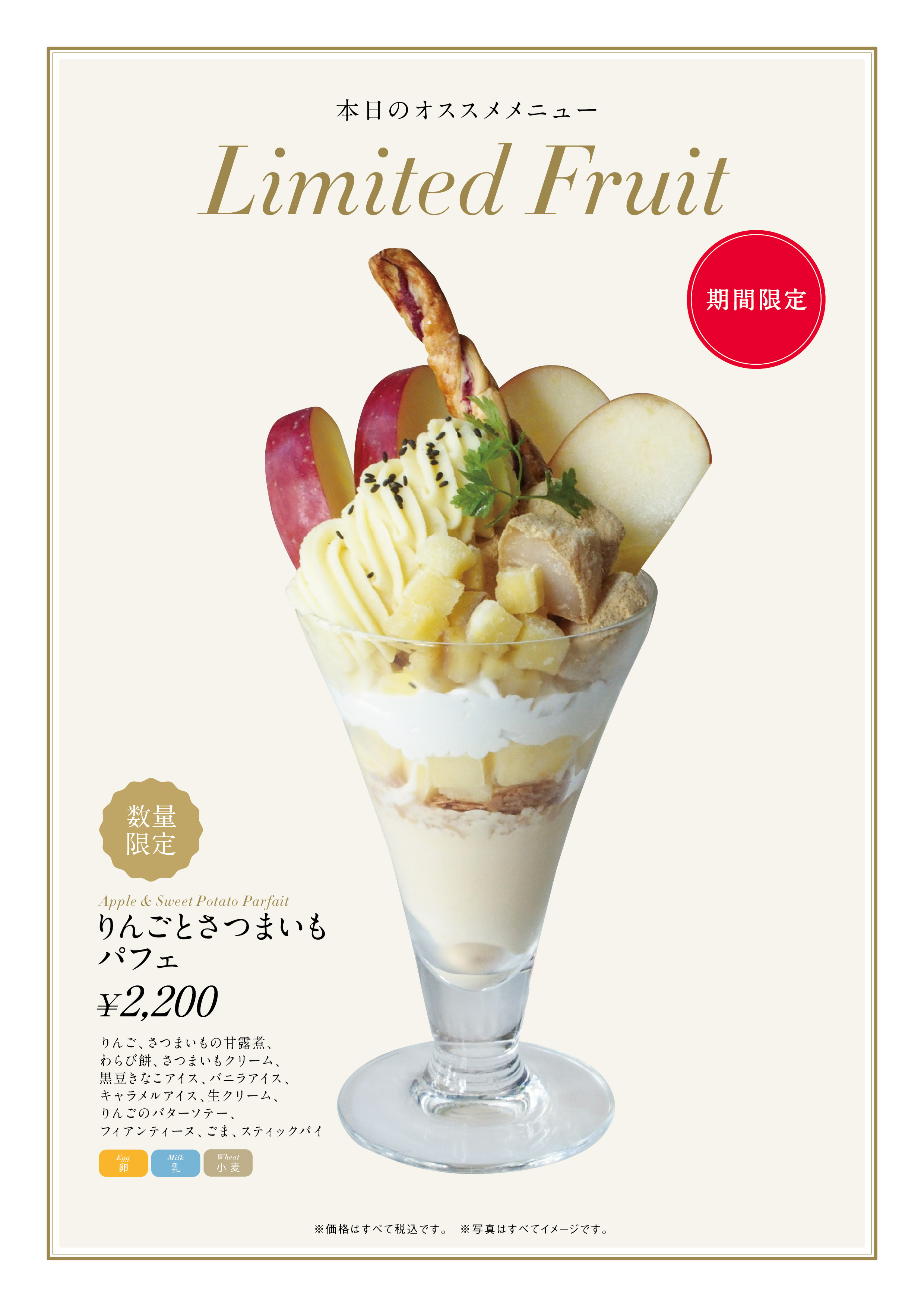 ・内容:りんご、さつまいもの甘露煮、わらび餅、さつまいもクリーム、黒豆きなこアイス、バニラアイス、キャラメルアイス、生クリーム、りんごのバターソテー、フィアンティーヌ、ごま、スティックパイ