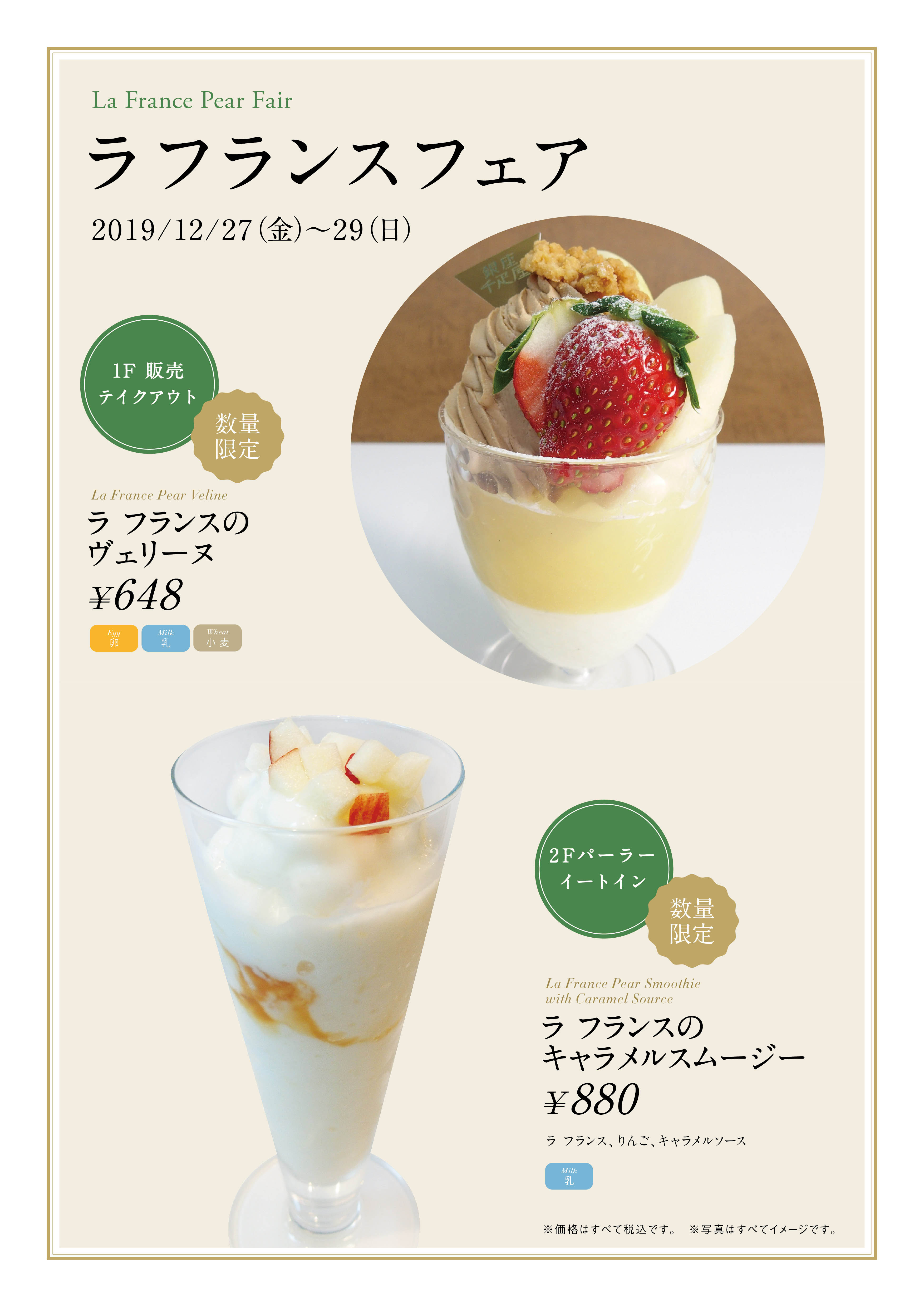 銀座千疋屋・パティスリー銀座千疋屋は、12月27日(金)〜12月29日(日)の期間限定にて、ラ フランスを使用したスイーツを数量限定販売いたします。