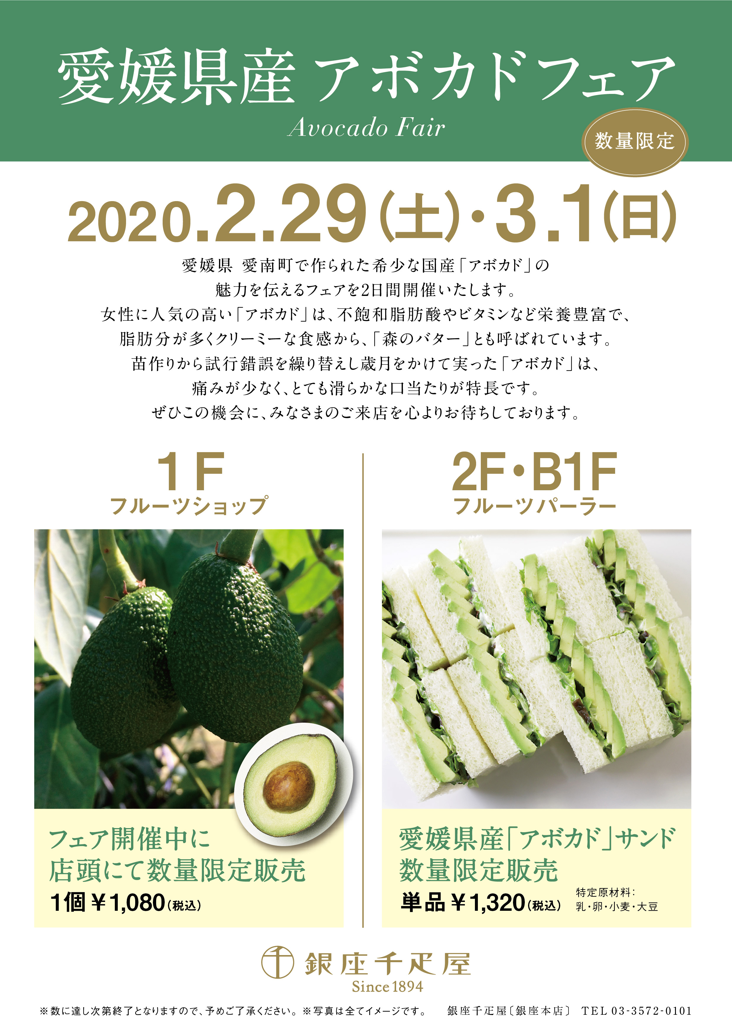 銀座千疋屋 銀座本店 フルーツショップ・フルーツパーラーでは、愛媛県 愛南町で育てられた希少な国産「アボカド」の魅力を伝えるフェアを開催いたします。