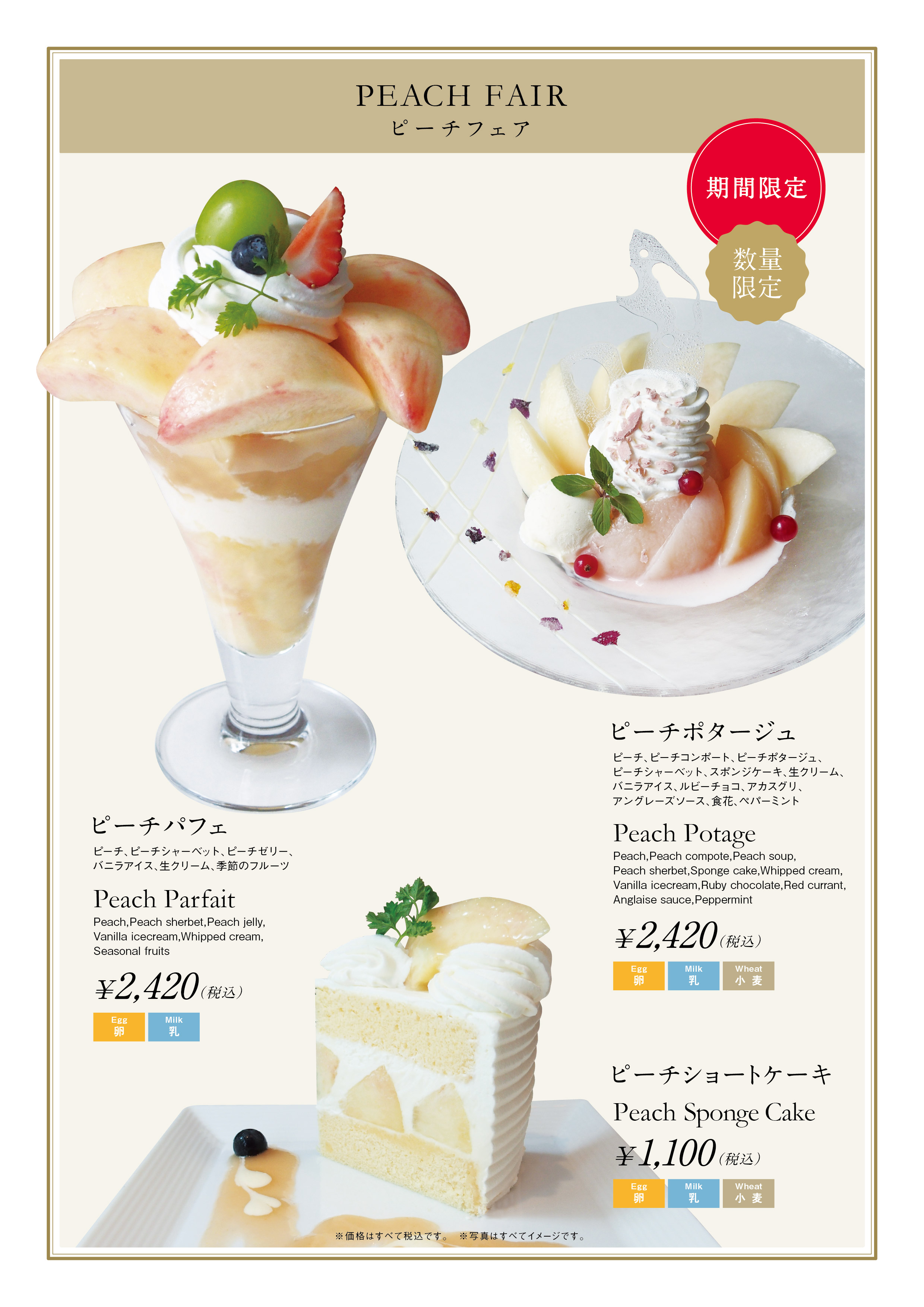 ・内容:ピーチ、ピーチシャーベット、ピーチゼリー、バニラアイス、生クリーム、季節のフルーツ