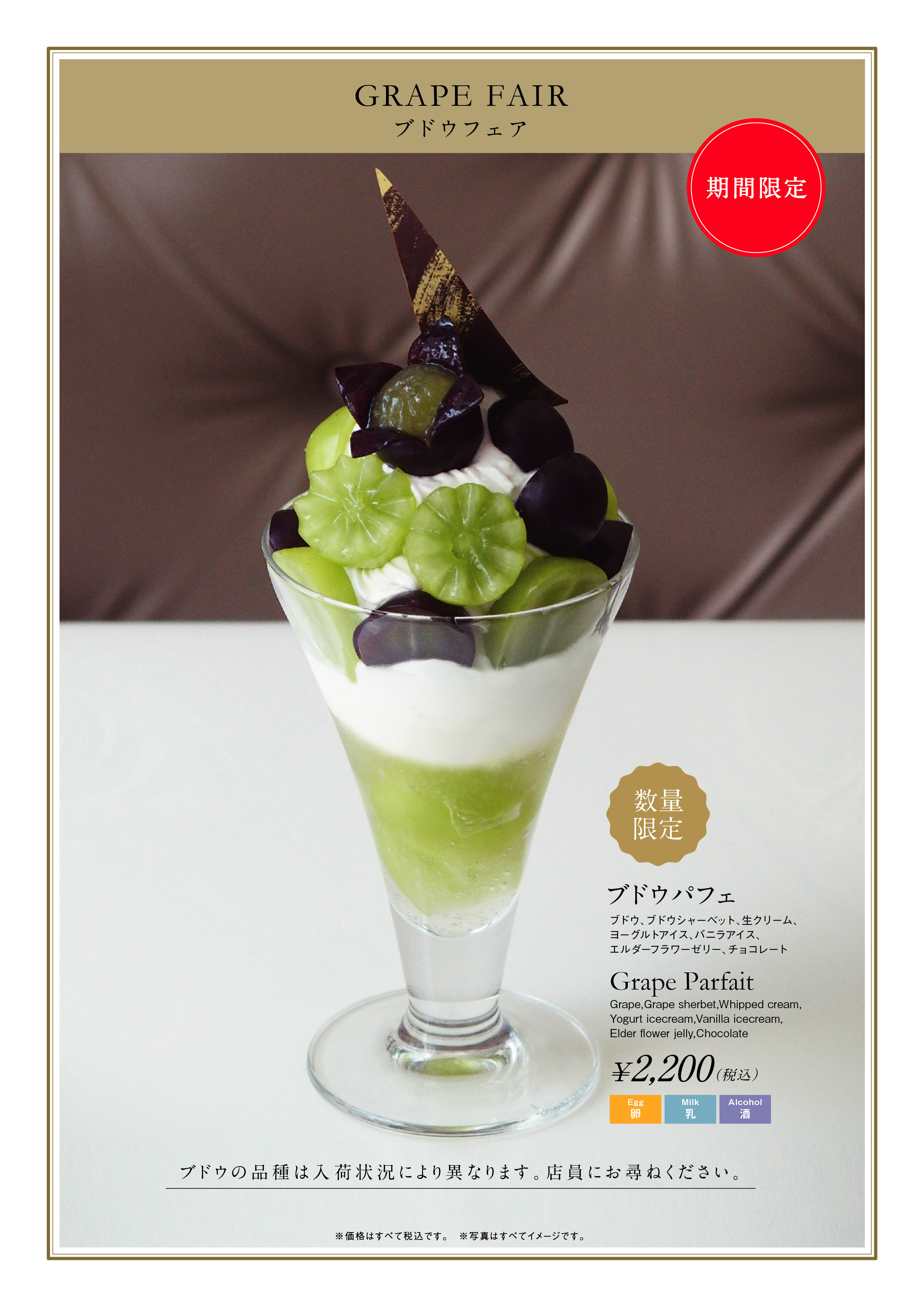 ・内容:ブドウ、ブドウシャーベット、生クリーム、ヨーグルトアイス、バニラアイス、エルダーフラワーゼリー、