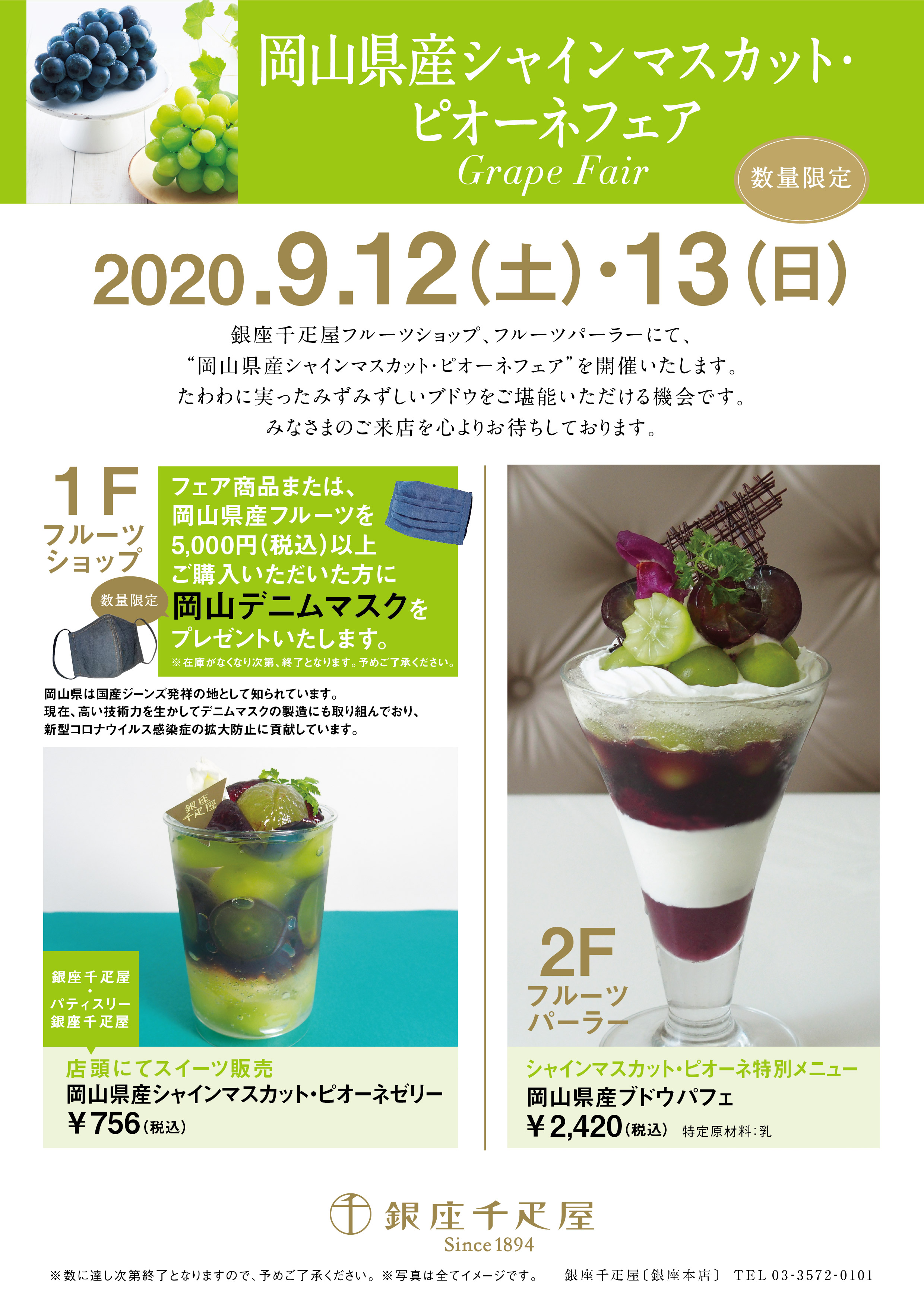 銀座千疋屋・パティスリー銀座千疋屋では、2020年9月12日(土)・9月13日(日)の2日間に渡り、岡山県産シャインマスカット/ピオーネフェア開催いたします。